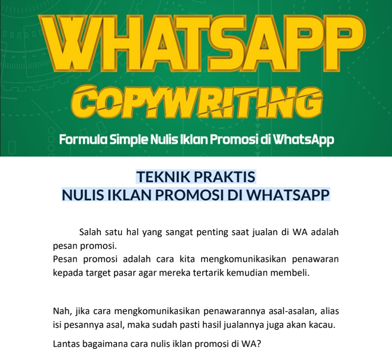 Dengan membeli ecourse ini, anda bisa menguasai skill membuat promosi yang bagus, agar dapat 5 juta perbulan hanya dari promosi di WA, dan gimana dapat 1000 kontak di whatsapp.